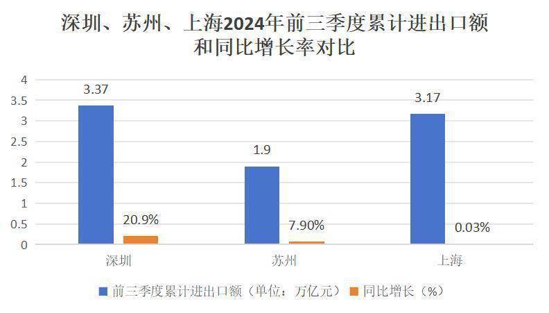 深圳、蘇州、上海2024年前三季度累計進出口額和同比增長率對比