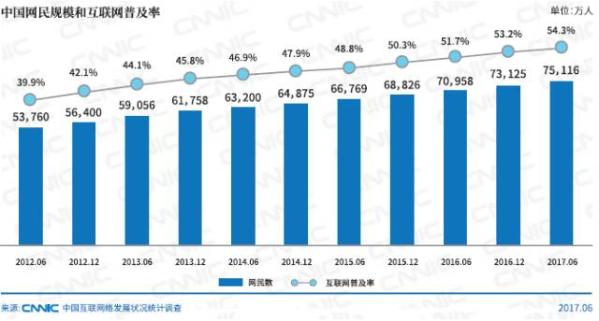 截至2017年6月,我國網(wǎng)民規(guī)模達到7.51億,半年共計新增網(wǎng)民1992萬人,半年增長率為2.7%。互聯(lián)網(wǎng)普及率為54.3%,較2016年底提升1.1個百分點。以互聯(lián)網(wǎng)為代表的數(shù)字技術(shù)正在加速與經(jīng)濟社會各領(lǐng)域深度融合,成為促進我國消費升級、經(jīng)濟社會轉(zhuǎn)型、構(gòu)建國家競爭新優(yōu)勢的重要推動力。