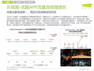 原標(biāo)題:艾瑞咨詢:上半年優(yōu)酷流量增速行業(yè)第一 多部大劇熱播助推 9月19日消息,今日,艾瑞咨詢發(fā)布《2025H1中國移動互聯(lián)網(wǎng)流量半年報告》。 報告顯示,今年上半年,憑借《難哄》
