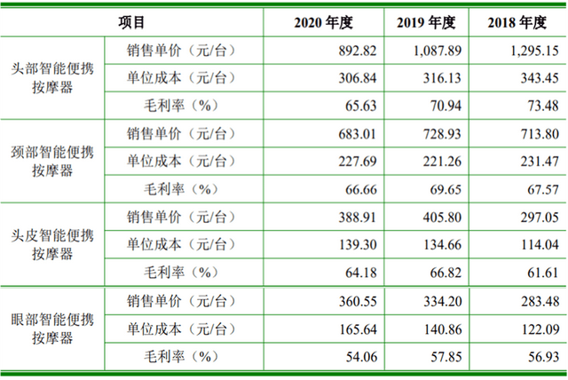 在倍輕松主打的四大產品體系中,近兩年,頭部、頸部和頭皮智能便攜按摩器銷售單價和毛利率均有所下降。其中,頭部智能便攜按摩器更是在三年內下降402.33元,降幅達到31%,而期間產品單位成本降幅只有10%左右,這也導致產品毛利率也從73.48%下降至65.63%。頸部和頭皮智能便攜按摩器更是在單位成本增加的基礎上,調低了售價,導致毛利率下降。