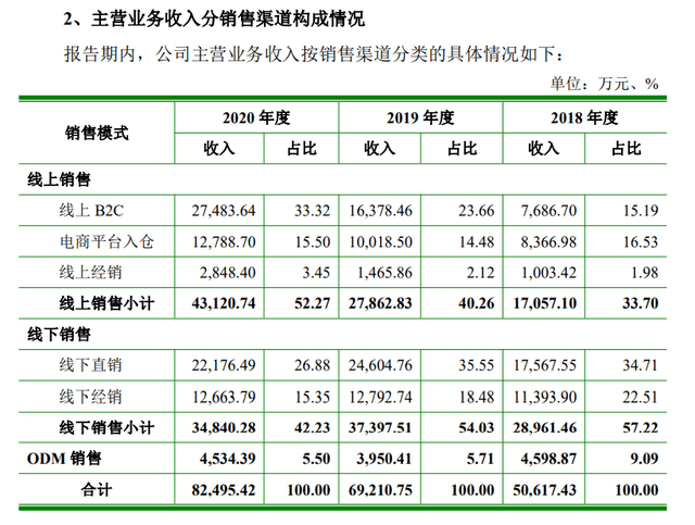 根據招股書,倍輕松目前主要采用“計劃生產”和“訂單生產”相結合的模式進行生產。后者主要針對其ODM代工加工業務,前者是根據對未來某段時間內市場所需產品種類和數量的預估來確定的。而這種生產模式,將與其越來越依賴的線上銷售方式發生沖突。