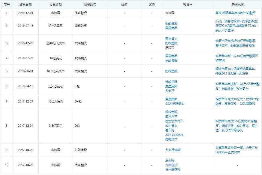 而持續虧損下,哈啰出行如何續命?天眼查信息顯示,2017年12月到2019年12月,哈啰出行一共獲得8輪融資,總額超過200億人民幣,8輪融資中螞蟻金服領投或者跟投5輪。在螞蟻金融的光環,哈啰出行也成為市場紅人,復星集團、春華資本、高榕資本、GGV紀源資本等機構相繼入局。