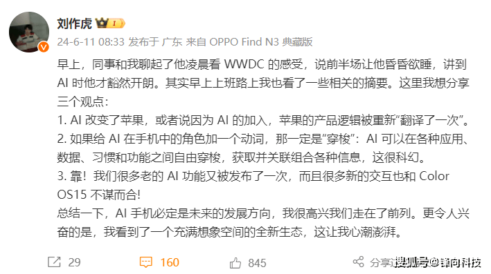 這不OPPO的劉作虎在第一時間就進行了點評,從他分享的觀點來看他最看重的是蘋果的AI功能。并且講了三點:
