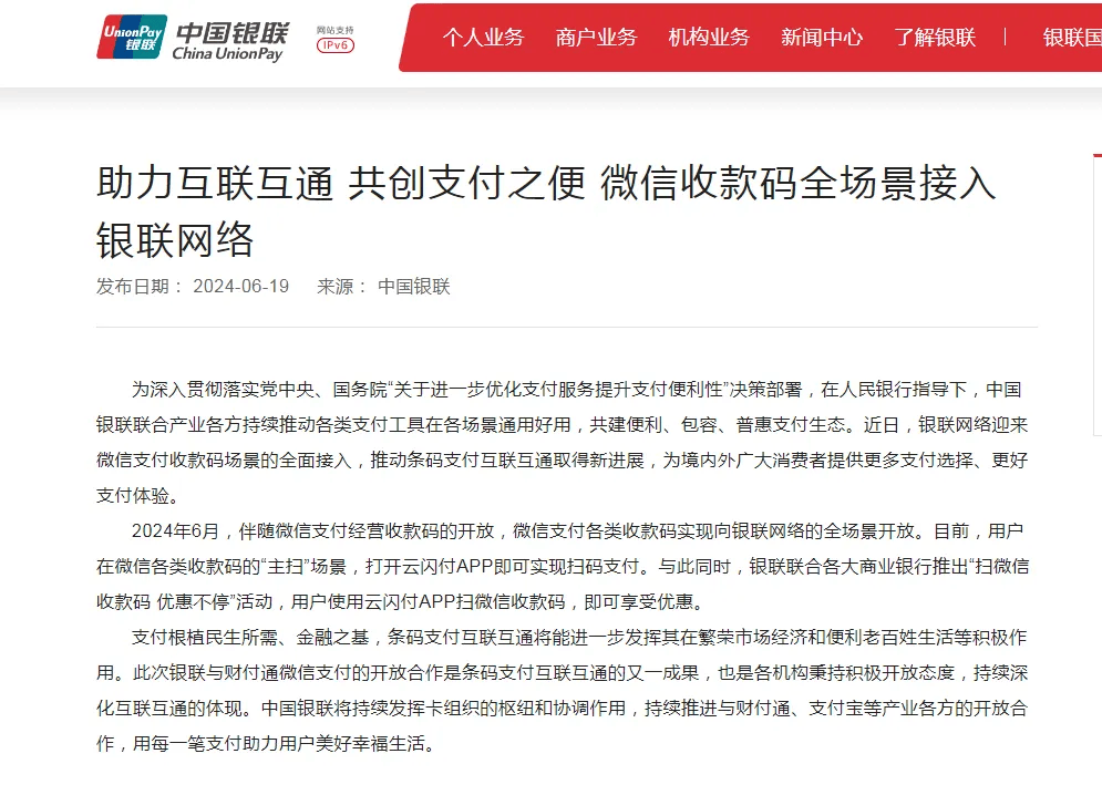 2024年6月,伴隨微信支付經營收款碼的開放,微信支付各類收款碼實現向銀聯網絡的全場景開放。目前,用戶在微信各類收款碼的“主掃”場景,打開云閃付APP即可實現掃碼支付。