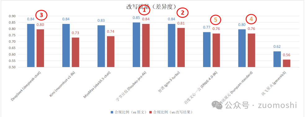 和改寫結果比是指,同樣的方法會生成3次內容,然后看BLEU值,把小于0.75的除以3就是上面的結果。當然提示詞中會包含加大差異度的部分。