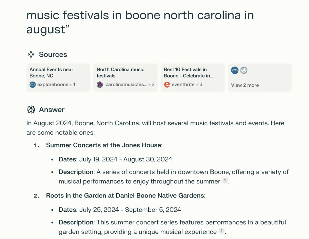 從演示視頻看,當(dāng)用戶輸入“music festivals in boone north carolina in august”(八月北卡羅來納州布恩的音樂節(jié)),SearchGPT在1秒后開始輸出內(nèi)容,并在3-4秒內(nèi)就完成了所有的內(nèi)容展示。