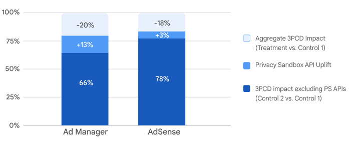 隱私沙盒對程序化收入的影響:在啟用Privacy Sandbox API的同時,刪除第三方Cookie,分別導致Google Ad Manager和Google AdSense發布商的程序化收入減少20%和18%。