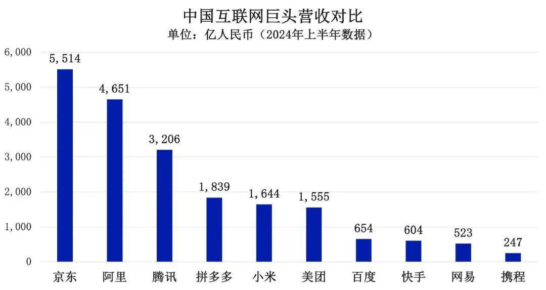 2024年上半年,營收超過3000億人民幣的巨頭有三家:京東、阿里、騰訊。