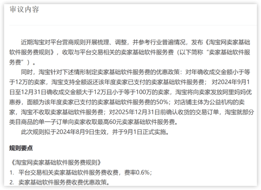 另外一個(gè)信息是,淘寶也是在 9 月 1 號(hào)起,向銷售者收取基礎(chǔ)軟件服務(wù)費(fèi),費(fèi)率為 0.6% 。
