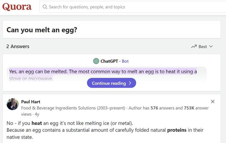 一開始一些用戶使用ChatGPT生成答案,然后秒成Quora的“專家”,后來Quora直接在頁面上集成了ChatGPT生成的答案,而這些錯誤的答案又傳播到了谷歌的搜索結果中。
