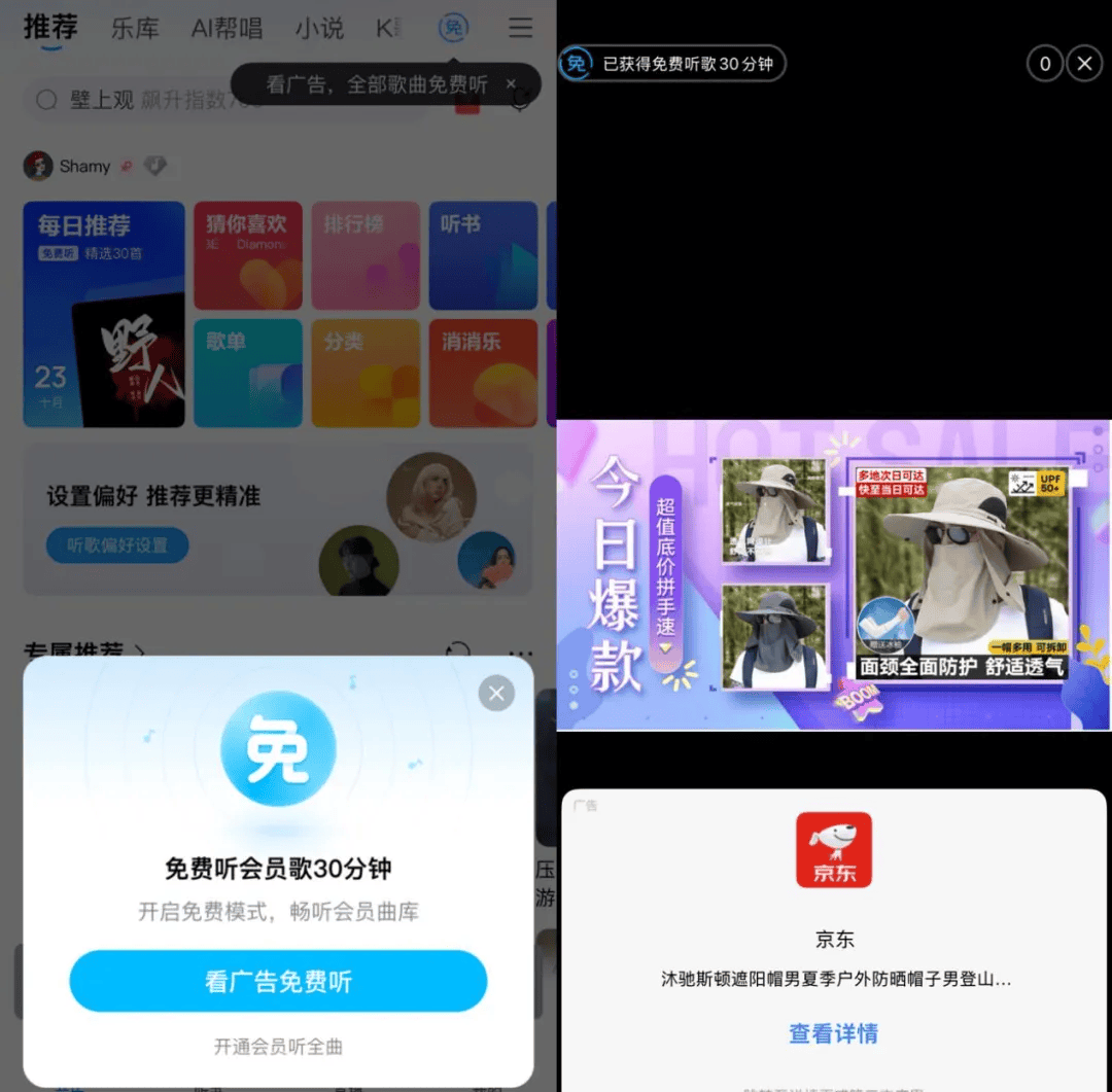 在看網(wǎng)文時(shí),你可能會因?yàn)榭磸V告免費(fèi)推送的商品鏈接,刷到你還在猶豫要不要下單購買的東西;在聽歌時(shí),你可能會因?yàn)榭磸V告免費(fèi)獲得聽歌時(shí)長,跳轉(zhuǎn)到其他APP去體驗(yàn)之前你不曾注意到的付費(fèi)功能……