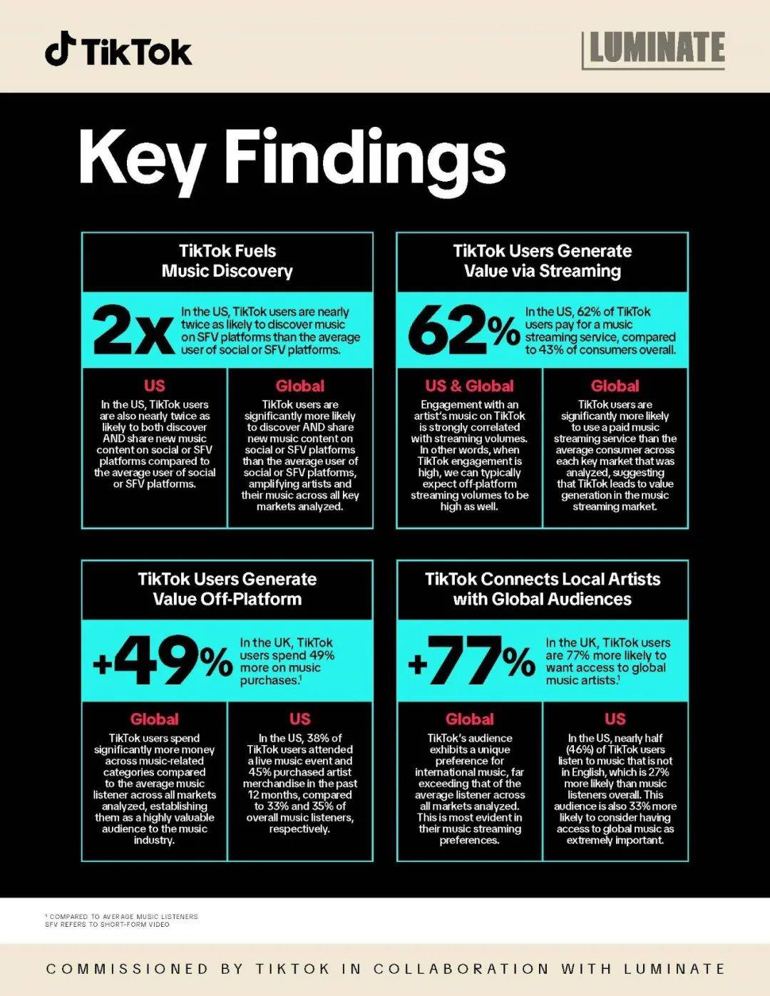 根據Luminate《音樂影響報告》顯示,在全球范圍內,用戶在TikTok上發現、分享音樂的可能性明顯高于其他平臺,TikTok用戶使用付費音樂流媒體服務的可能性也明顯高于普通消費者。