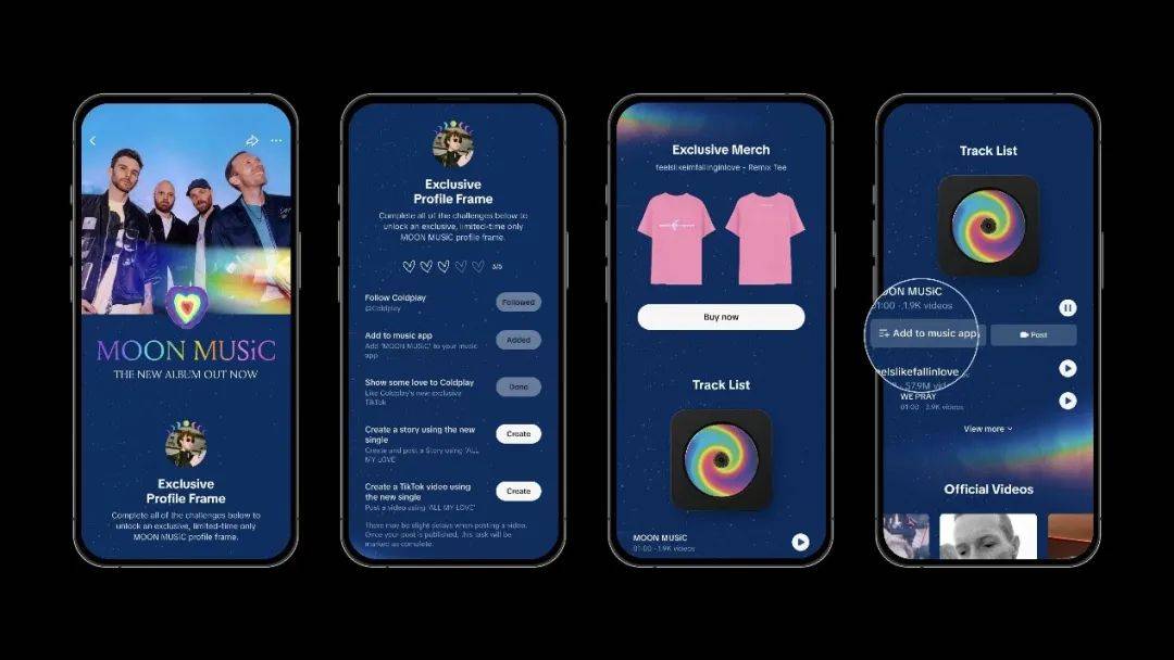 隨著音樂與社交平臺的深度融合,該功能已經開始發揮作用。今年10月4日,Coldplay與TikTok合作為其新專輯《MOON MUSiC》的發布推出了一項互動體驗。用戶可以在TikTok Shop(僅限美國)購買獨家周邊商品,或將其專輯內歌曲添加至音樂應用,則可以獲得Coldplay主題的個人資料框。