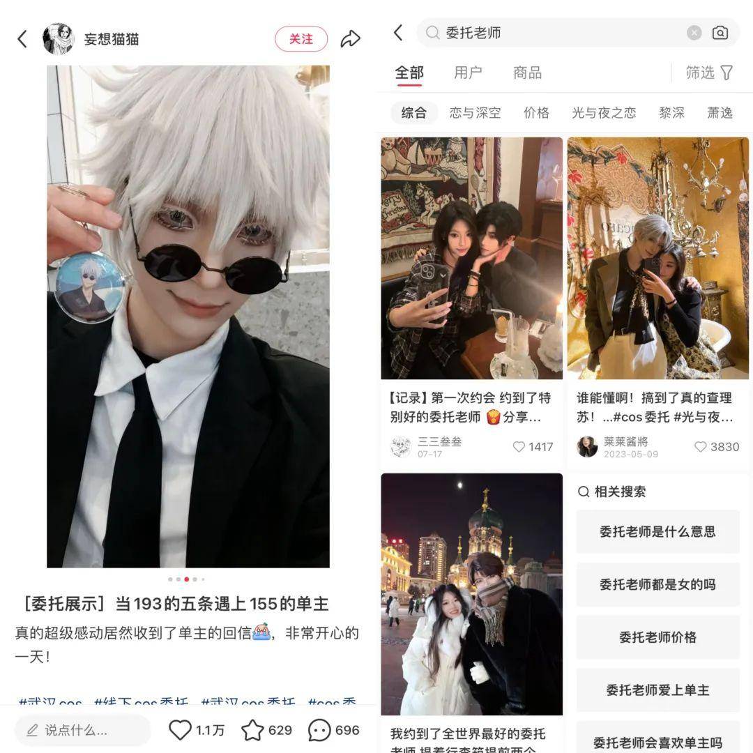 cos委托是cosplay文化的一種延伸服務。雙方大多都是女生,其中發起委托的人作為單主,會在類似小紅書、閑魚或微店這樣的平臺上發布信息,說明她想要扮演的角色和約會的細節,每單報價在日均幾十元到幾千元不等。接受委托的人即委托老師,會根據“單主”的要求來做相應的準備。