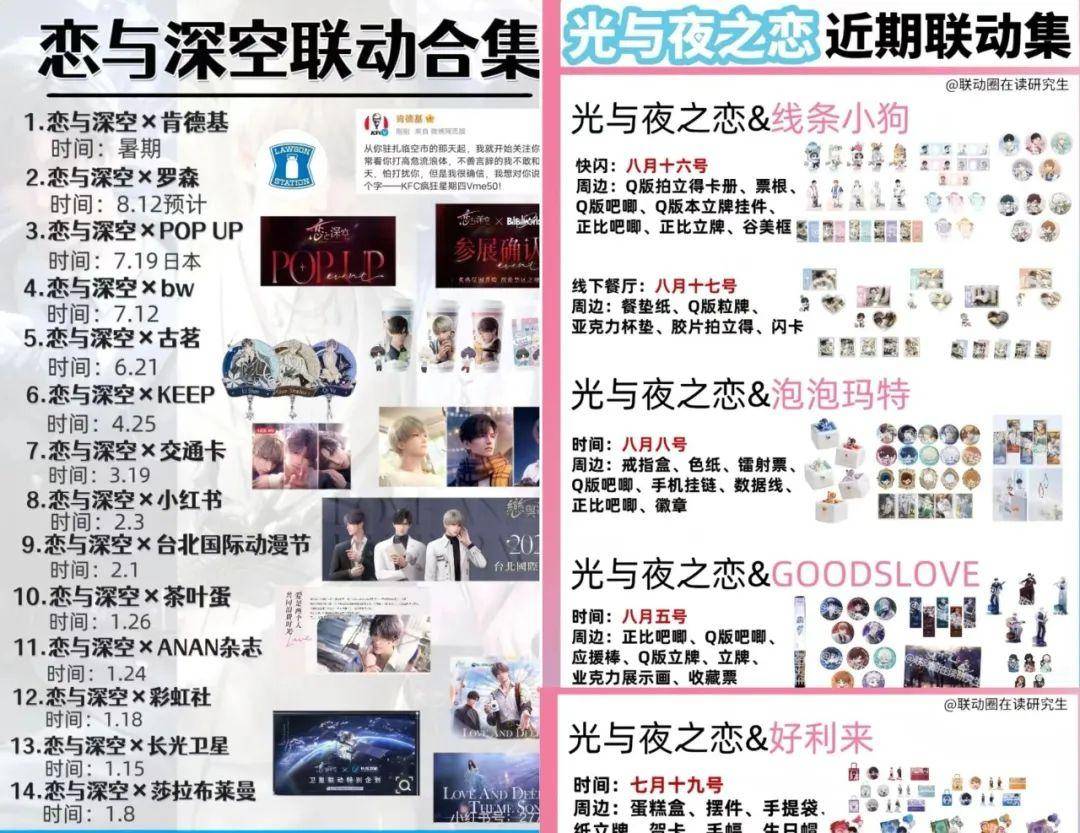 如此火爆的聯名數不勝數,8月,羅森和《戀與深空》聯名,12塊的徽章一周賣掉了超170萬份的周邊;7月,好利來和《光與夜之戀》聯名,其為游戲內五位男主角分別定制了五款不同口味的蛋糕和五款不同口味的半熟芝士,上線就賣爆;6月,古茗和《戀與深空》聯名,20分鐘直接售罄;3月,喜茶和《光與夜之戀》聯名,奶茶店的單子直接變門簾……