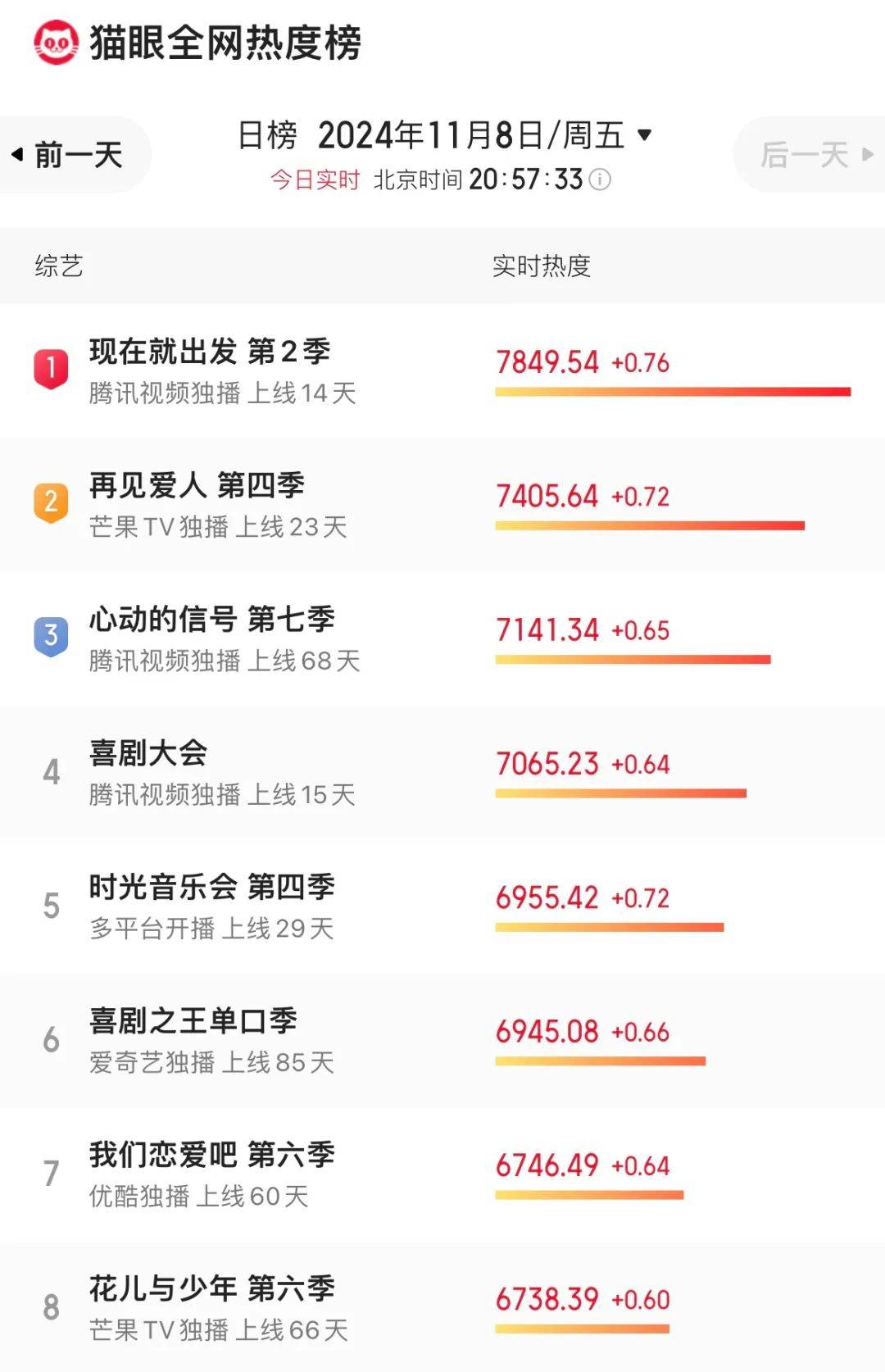 根據貓眼專業版數據,情感類綜藝在全網熱度榜前十中占到三席,而《再見愛人4》和《心動的信號7》連續多日位居前三,已經超過了綜藝市場的傳統大熱門音綜、旅綜和喜綜,聚焦兩性關系的情感類綜藝正在悄悄彎道超車,以更具爆點的內容逐漸成為綜藝市場的新頂流。
