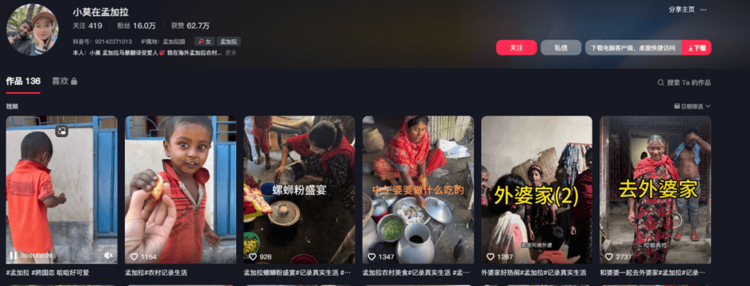 不僅在國內(nèi),在海外也有一批“苦瓜大隊(duì)”出現(xiàn)。如@小莫在孟加拉被網(wǎng)友認(rèn)為能PK贏過小英的博主,家庭條件簡陋、用手抓著吃飯,讓網(wǎng)友對其從中國遠(yuǎn)嫁到孟加拉表示很不理解。