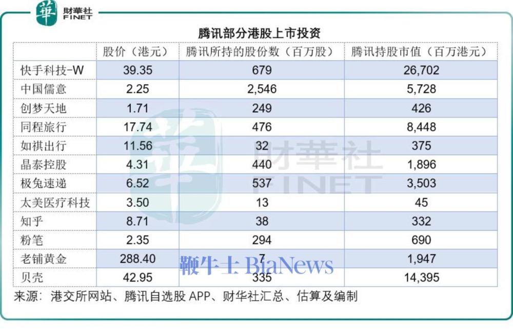 從港交所權益披露的數據來看,騰訊還持有中國儒意(00136.HK)(市值322.63億港元)的17.75%權益(H股權益,下同)、創(chuàng)夢天地(01119.HK)(市值28.71億港元)的14.74%權益、同程旅行(00780.HK)(市值412.88億港元)的20.98%權益、如祺出行(09680.HK)(市值23.60億港元)的15.87%權益、快手-W(01024.HK)(市值1,699.93億港元)的19.02%權益、晶泰控股(02228.HK)(市值147.12億港元)的12.91%權益,極兔速遞(01519.HK)(市值578.28億港元)的6.86%權益、太美醫(yī)療科技(02576.HK)(市值19.73億港元)H股的6.47%、知乎(02390.HK)(市值22.82億港元)H股的15.44%、粉筆(02469.HK)(市值52.40億港元)的13.11%權益、老鋪黃金(06181.HK)(市值485.57億港元)H股的7.38%、貝殼(02423.HK)(市值1,504.94億港元)H股的9.63%。