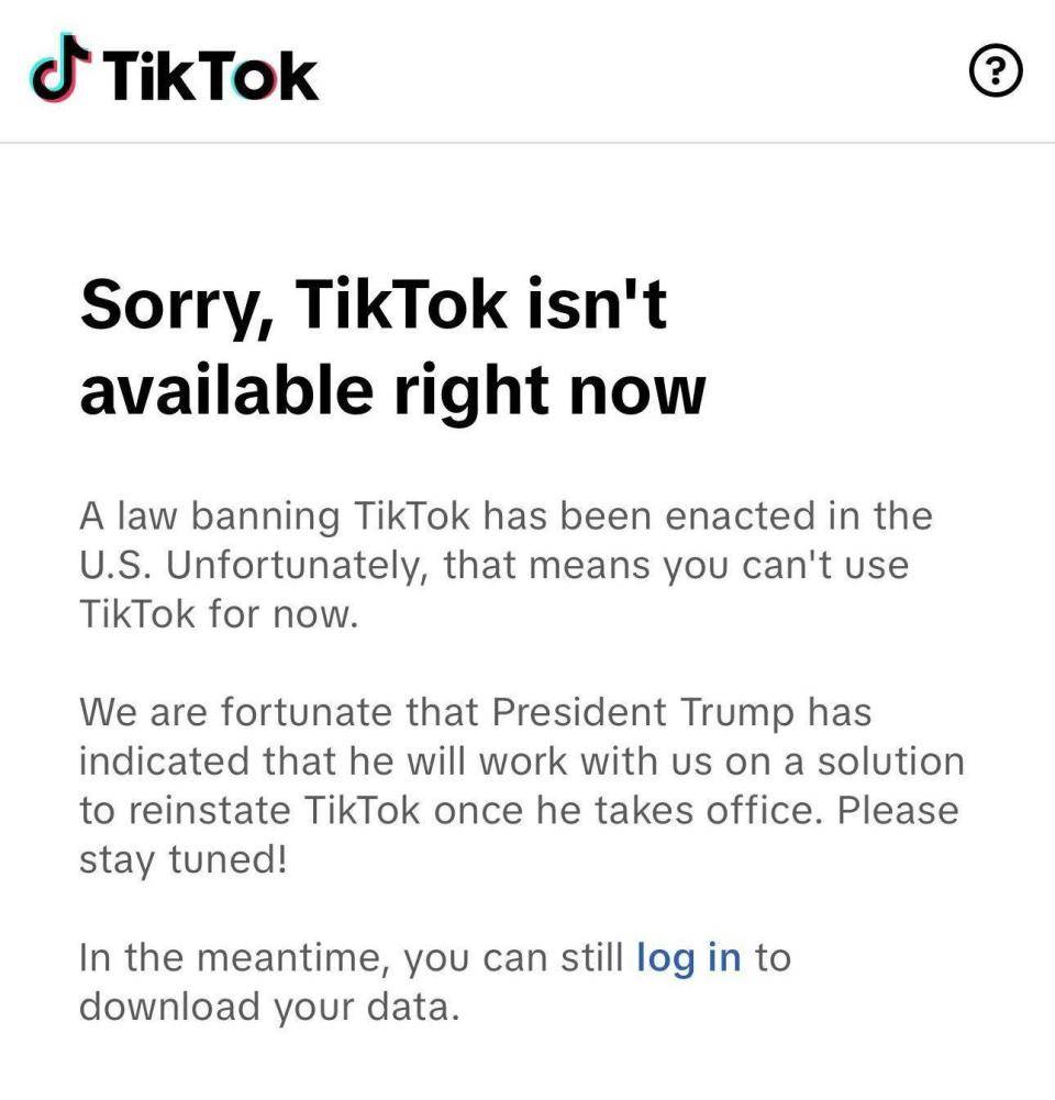 TikTok對美國用戶發布的最新通知顯示:美國已頒布禁止TikTok的法律,這意味著您暫時無法使用TikTok。候任總統特朗普已表示,他上任后將與我們一起研究恢復TikTok的解決方案。請繼續關注!