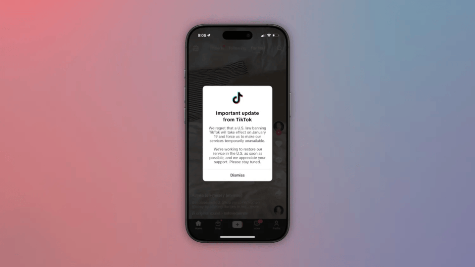通知內容顯示:我們很遺憾,一項封禁TikTok的美國法律將于1月19日生效,并迫使我們暫時停止提供服務。我們正盡快努力在美國恢復我們的服務,我們感謝各位的支持。請保持關注。