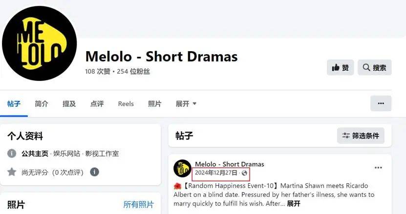 在社媒傳播層面,Melolo 營銷力度也不算大。截至目前,Melolo 官方賬號僅進駐了 Facebook,且粉絲數僅 254 位,12 月底后未再更新,尚未入駐YouTube、INS等其他平臺。