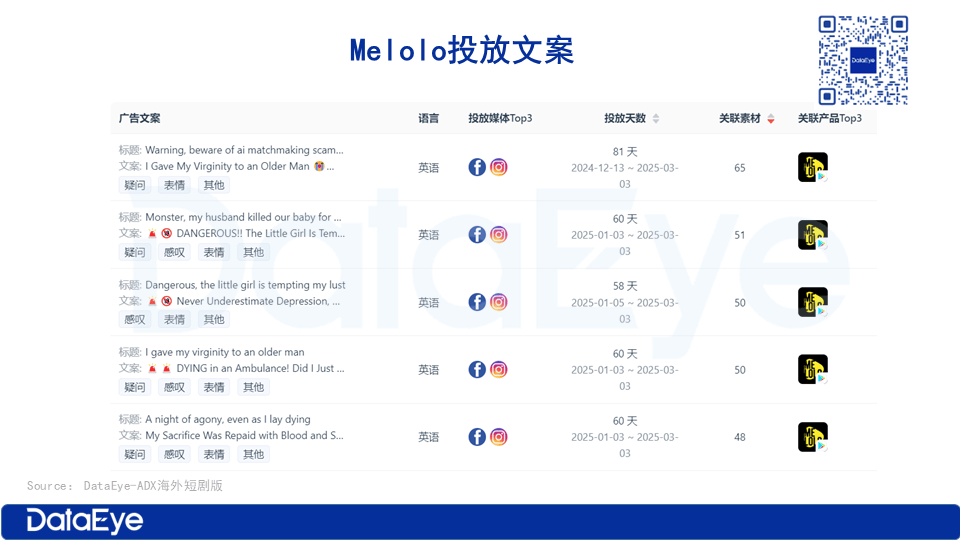 從投放文案來看,Melolo的熱門投放文案非常“標題黨”,廣告文案與國內短劇文案大同小異。