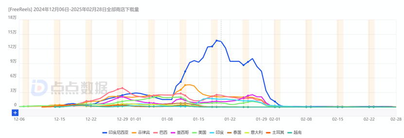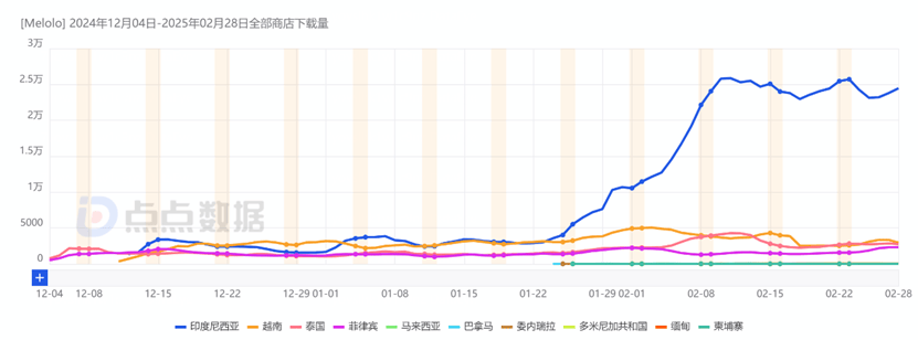 據點點數據顯示,從2024年12月4日至2025年2月28日,Melolo全球雙端的預估下載量已超過132萬次。