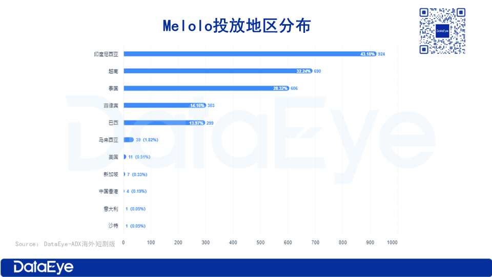 從投放市場來看,Melolo主投東南亞市場。根據DataEye-ADX海外版數據,過去90天,印度尼西亞市場的投放素材量位居首位,占比達到43.18%。越南、泰國分別以32.24%、28.32%的素材投放比例緊隨其后,菲律賓的素材投放比例為14.16%。總的來看,Melolo的投放地區和下載量趨勢基本保持一致。