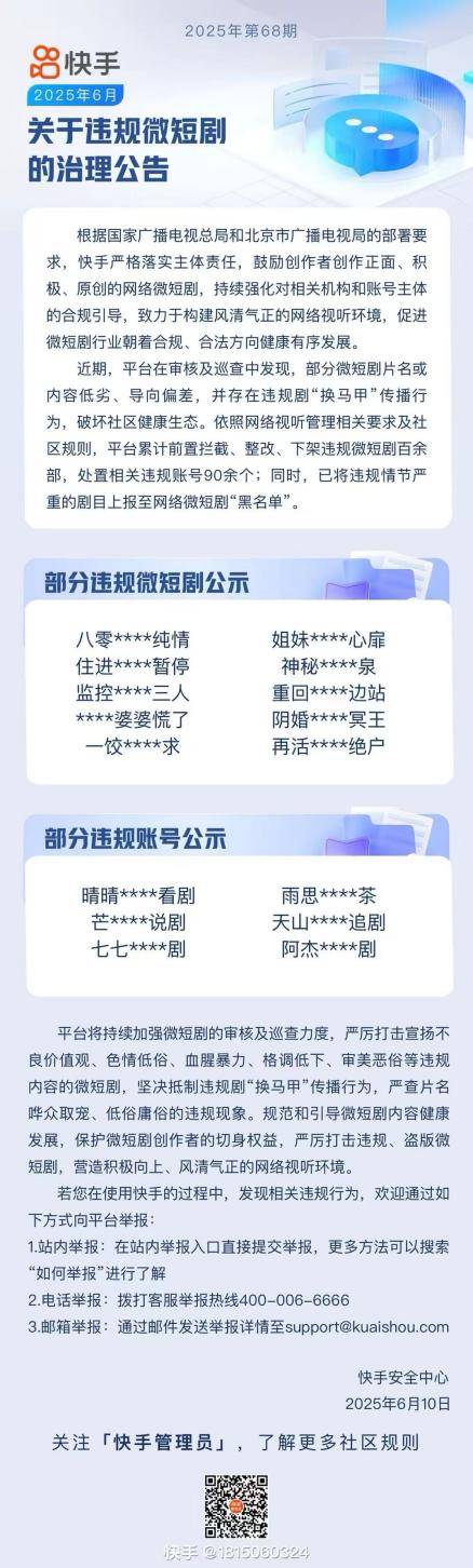為了維護平臺內(nèi)容生態(tài)的健康與穩(wěn)定,快手在2025年6月采取了一系列嚴厲措施。據(jù)統(tǒng)計,當月快手下架了百余部違規(guī)微短劇,并對90余個違規(guī)賬號進行了處理。對于情節(jié)嚴重的劇目,快手更是將其列入了黑名單,以示懲戒。
