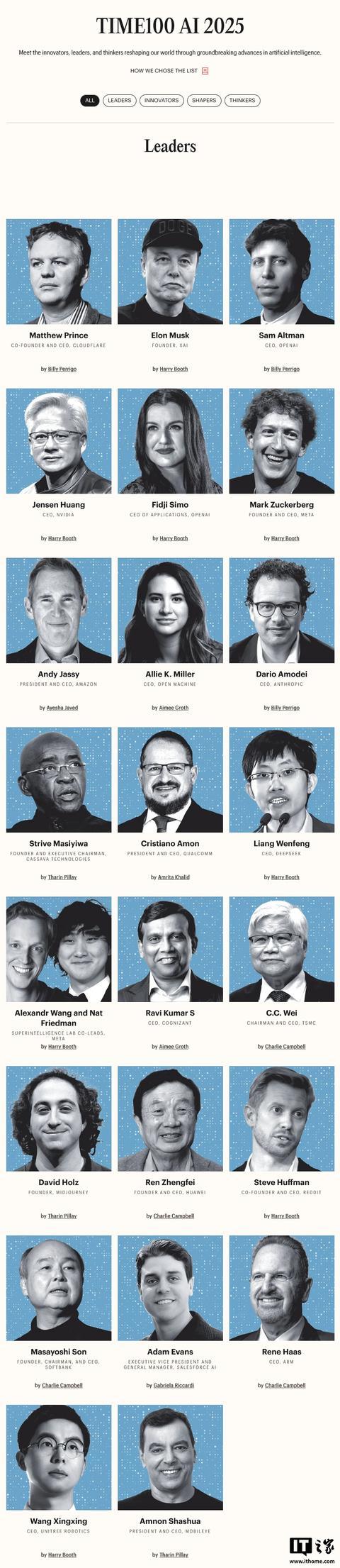 除了上述人物外,“領導者”榜單還涵蓋了眾多行業領袖,如Cloudflare的聯合創始人兼CEO馬修·普林斯、英偉達聯合創始人兼CEO黃仁勛、meta創始人兼CEO馬克·扎克伯格、高通CEO阿蒙、臺積電董事長兼CEO魏哲家、軟銀創始人董事長兼CEO孫正義等。DeepSeek的創始人兼CEO梁文鋒、宇樹科技的創始人兼CEO王興興,以及meta的首席AI官汪滔(Alexandr Wang)同樣榜上有名。
