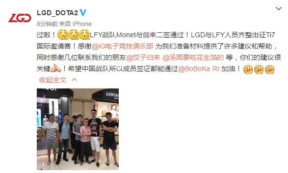 就在剛剛,LGD官博宣布LFY戰隊的Monet與劍來的簽證順利通過,接下來的時間可以全力備戰TI7!