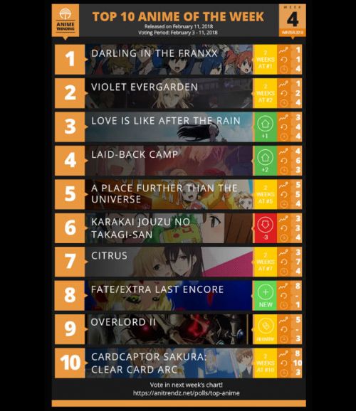 除此之外,《擅長捉弄人的高木同學》《citrus——柑橘味香氣——》《Fate/EXTRA Last Encore》《OVERLORD》以及《魔卡少女櫻 CLEAR CARD篇》等作品也都榜上有名。整體來看,本周有5部作品保持了跟上周相同的排名,整體趨勢也偏向于穩(wěn)定。