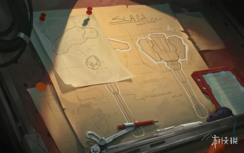 可以看到圖中圖紙上畫(huà)著一把鐵錘,這很容易就讓人聯(lián)想到托比昂的近戰(zhàn)武器小鐵錘,而深入分析圖片的細(xì)節(jié)之后我們還能夠獲得更多詳細(xì)信息。