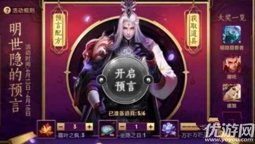 小伙伴一般在你登錄游戲的時候,就會彈出這個預言活動,實在找不到入口的可以,點擊大廳右邊-活動-限時活動-明世隱的預言開啟永久皮膚,選擇去參與就可以收集道具開啟預言抽獎了。
