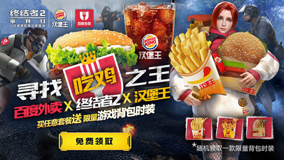 在此次活動中,百度外賣、漢堡王、《終結者2》三方首次開啟異業合作,將吃雞玩法與美食文化融為一體,讓玩家在感受酣暢淋漓的槍戰競技之時,還能夠享受到鮮香可口的真雞美味。早在去年的11月份,剛剛上線不久的《終結者2》就與百度外賣開展了深度合作,“百度外賣”的主題出現在定制跳傘、特定時裝、載具及補給包等物品上,為玩家帶來了濃厚的生活氣息,也讓戰場上的“點外賣、送快遞”歡樂氣氛更加強烈。