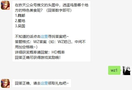 在昨天公眾號推文的頭圖中,逍遙雞是哪個地方的特色美食呢?這是2020年王者榮耀9月9日微信每日一題的問題,大家知道這個問題的答案嗎?回答正確可獲得每日有禮答題智勝的抽獎資格,有機會獲得永久皮膚哦。下面小編就為帶來了今日王者榮耀每日一題答案,一起來看看吧。