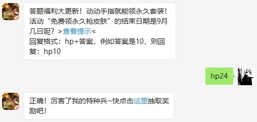 答題福利大更新!動動手指就能領永久套裝!活動“免費領永久槍皮膚”的結束日期是9月幾日呢?>查看提示<