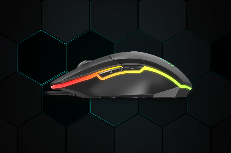 在達爾優牧馬人EM910輕量化游戲鼠標上,設有科技感十足的全包圍側裙RGB燈帶,鼠標底部設有一鍵切換燈光模式按鍵,多種燈效隨心切換,讓達爾優牧馬人EM910輕量化游戲鼠標個性十足,給你更強烈的競技觸感。