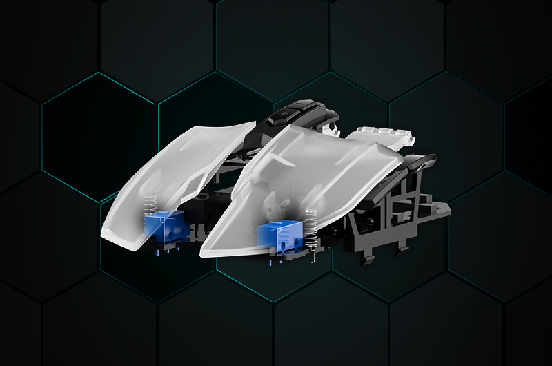 KBS按鍵衡力系統是由達爾優獨立開發,于2018年發布于EM945游戲鼠標上的技術,在達爾優牧馬人五代游戲鼠標上也進行了優化與延用。達爾優KBS按鍵衡力系統結合分體式按鍵設計,通過轉軸長力臂的方式,讓鼠標按鍵有效受力面積擴大,在不同點位按下,也可以正常觸發,加上微動上的彈簧設計,使得按鍵不同位置按下的受力均衡,手感一致。
