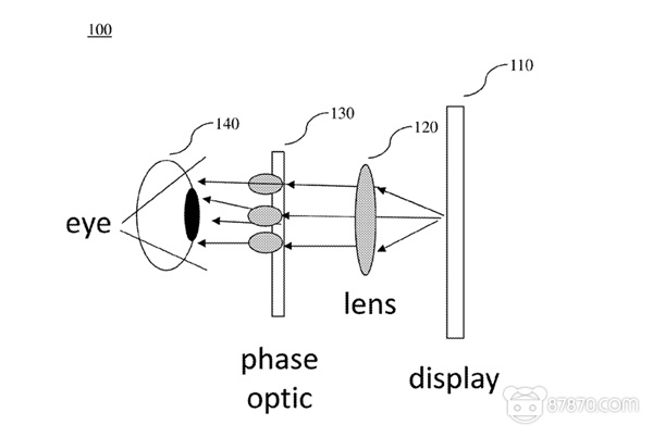 文件顯示,“由顯示面板的周期結構所引起的紗窗效應視覺偽影可能會因此而顯著減少”。從上圖可以看出,這種相位光學元件是介于透鏡與用戶眼睛之間,而且更靠近眼睛。