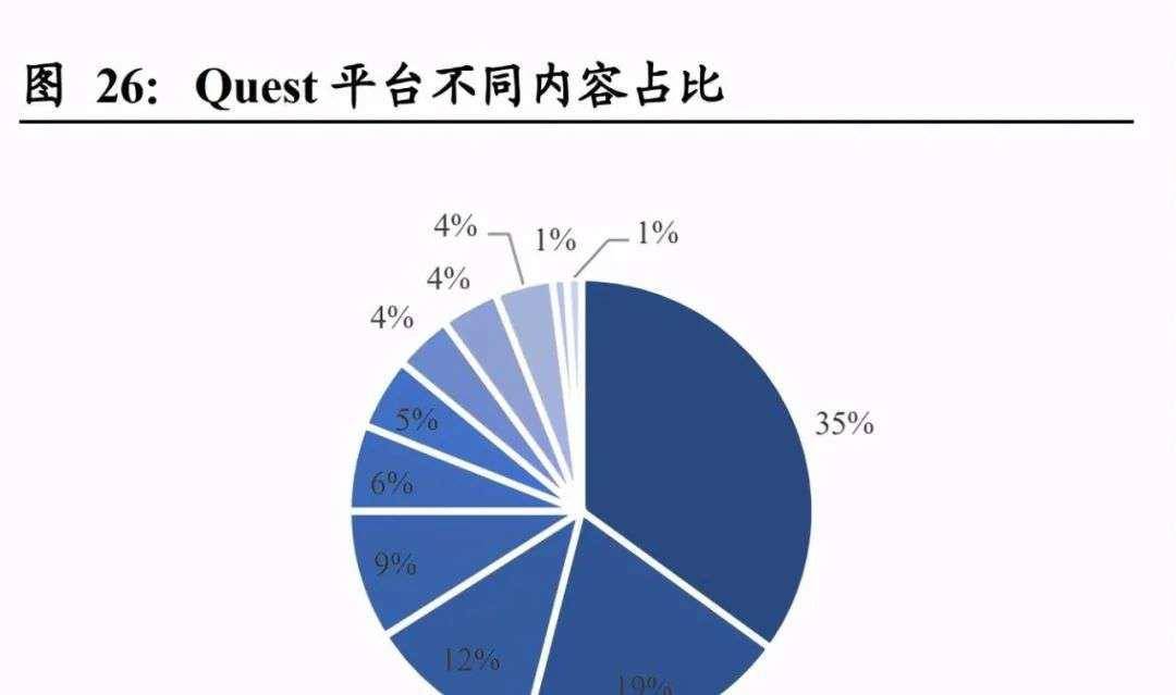 而參考Quest平臺截至 2020年11 月的 VR 應(yīng)用內(nèi)容占比也能發(fā)現(xiàn),其中動作應(yīng)用(動作、射擊、體育等動作類游戲)占比 35%,是主要的 VR 應(yīng)用場景。