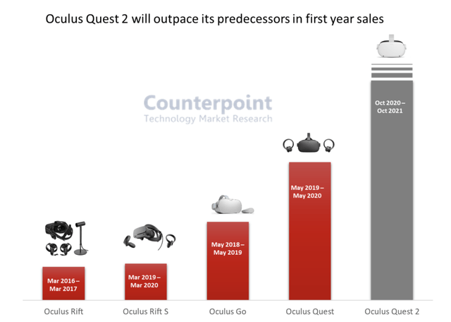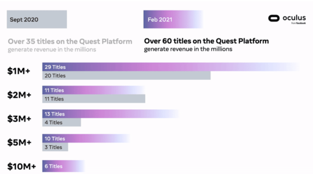 因此,適合VR產(chǎn)品的消費內(nèi)容可能更多還是益智、探索、影視、大型游戲等相關(guān)品類,尤其是游戲,比如魔獸、使命召喚等大型游戲。從目前來看,F(xiàn)acebook在VR產(chǎn)業(yè)上的突出表現(xiàn)也與游戲內(nèi)容相關(guān)。Facebook在2020年Q4財報電話會話中透露Quest平臺超60款游戲收入超100萬美元。而Quest平臺上線兩年的253款游戲評論數(shù)超25萬條,趕超2016年推出的Oculus PC平臺評論數(shù)總和。