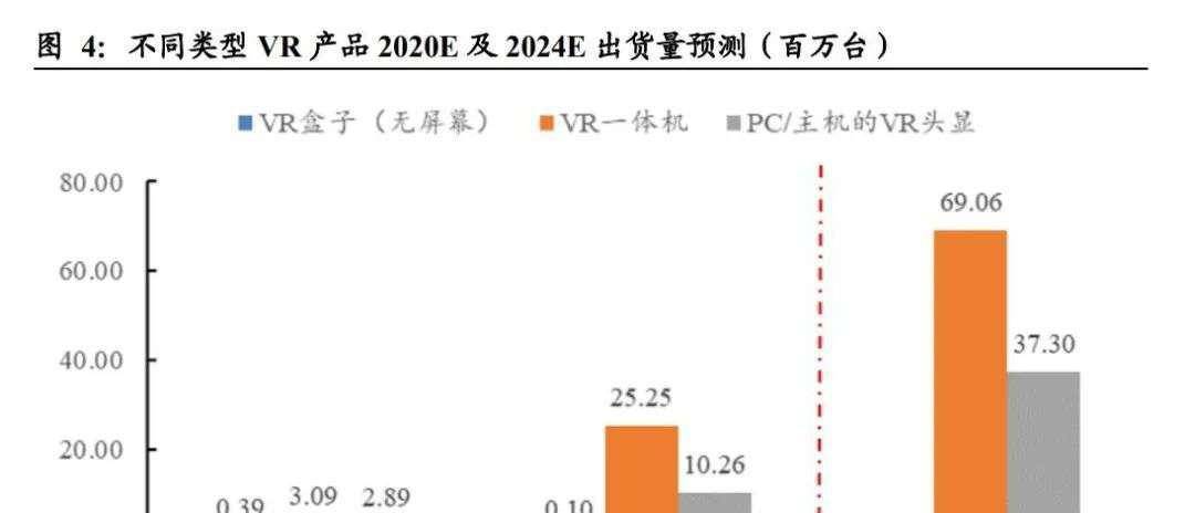 根據(jù) IDC 的數(shù)據(jù)預(yù)測,于 2020 年開始,VR 一體機將持續(xù)保持高速增長,VR 盒子 將逐步退出,預(yù)計到 2024 年,VR 一 體機成為市場主流設(shè)備,全球年出貨量達 2525 萬。