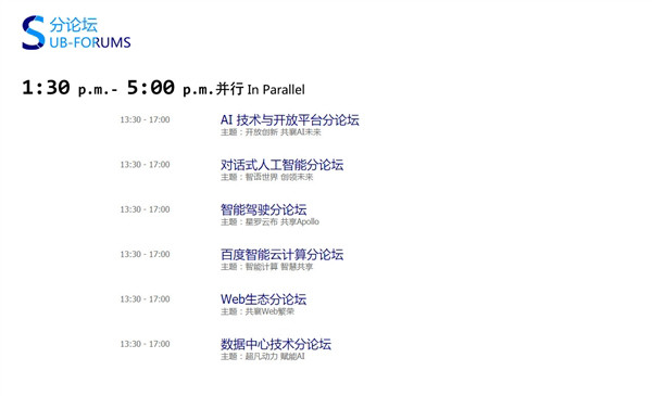 此次百度AI開發者大會共有一個主論壇和6個分論壇,主論壇是7月5日當天上午那場4000人規模的論壇,六個不同主題的分論壇,分別聚焦AI基礎技術、對話式操作系統、智能駕駛、智能云、Web生態和數據中心技術六大領域,呈現更為具體的技術開放細節及合作方案。