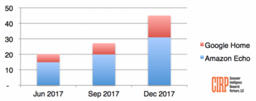 根據(jù)CIRP分析數(shù)據(jù)顯示,今年購物假期智能音箱的銷量新增1800萬臺(tái),在12月底的銷量在4500萬臺(tái)左右。其中亞馬遜Echo/Alexa設(shè)備的銷量為3100萬臺(tái),占比為69%;Google Home的銷量為1400萬臺(tái),占比為31%。