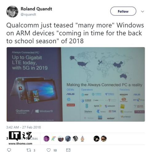 IT之家2月28日消息 微軟和高通合作推出的首批Windows 10 on ARM筆記本將在2018年Q1季度上市,但根據高通方面消息,這僅僅是第一批Windows 10 ARM筆記本,也就是所謂的Always Connected PC設備,在今年底還會有更多的Windows 10 ARM筆記本產品到來。