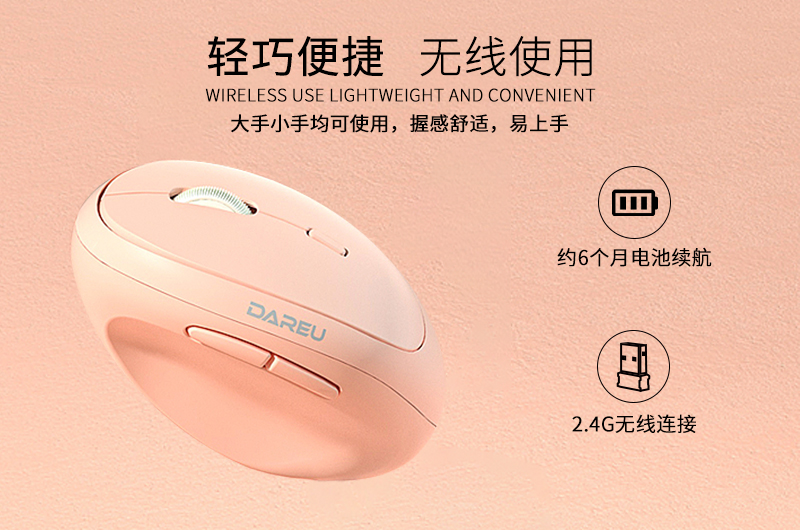 達爾優LM158G無線垂直鼠標采用進一步優化的人體工程學設計,48°垂直握感更貼近自然握姿。讓手腕呈自然彎曲狀態,貼合手掌、減少手肘手臂運動,更舒適的握感,解放手腕告別鼠標手。達爾優LM158G無線垂直鼠標選用柔性親膚材質,防滑防汗漬,手感更細膩舒適。
