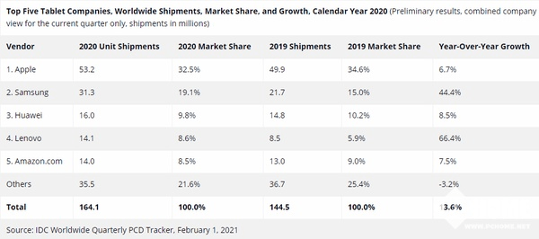 IDC:2020 年第四季度全球平板電腦同比增長 19.5%