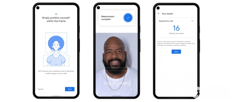心率監(jiān)測(cè)的工作原理是將手指放在背部攝像頭上,這是一種很實(shí)用的檢查心率的方法。至于呼吸頻率,你必須站在前置攝像頭前,這樣攝像頭就能夠捕捉你的臉部和軀干。攝像頭會(huì)跟蹤你的胸部運(yùn)動(dòng),以追蹤你的呼吸。谷歌方面還指出,這些功能不是用于醫(yī)療目的。