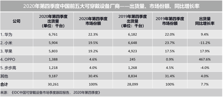 在IDC發(fā)布的《2020年第四季度中國可穿戴設(shè)備市場追蹤報(bào)告》中,前五大可穿戴設(shè)備廠商更是不見華米蹤影。華為、小米、蘋果三家就合計(jì)占據(jù)了61%的市場份額,這意味著華米自主品牌要在本就狹小的市場空間內(nèi)與眾多對(duì)手展開新一輪廝殺。